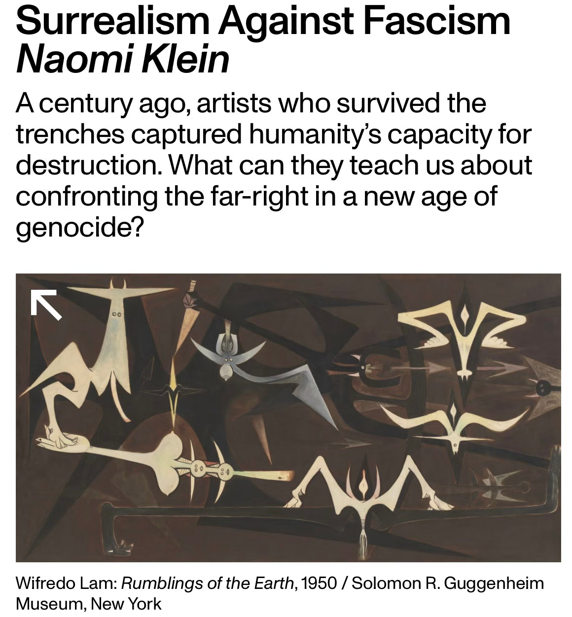 Naomi Klein offered a thoughtful essay on the exhibit, which she saw at the Pompidou in Paris, providing a great companion to considering these works and the surrealist movement as a whole, in ways that inform and enrich our own precarious time. Read it here.