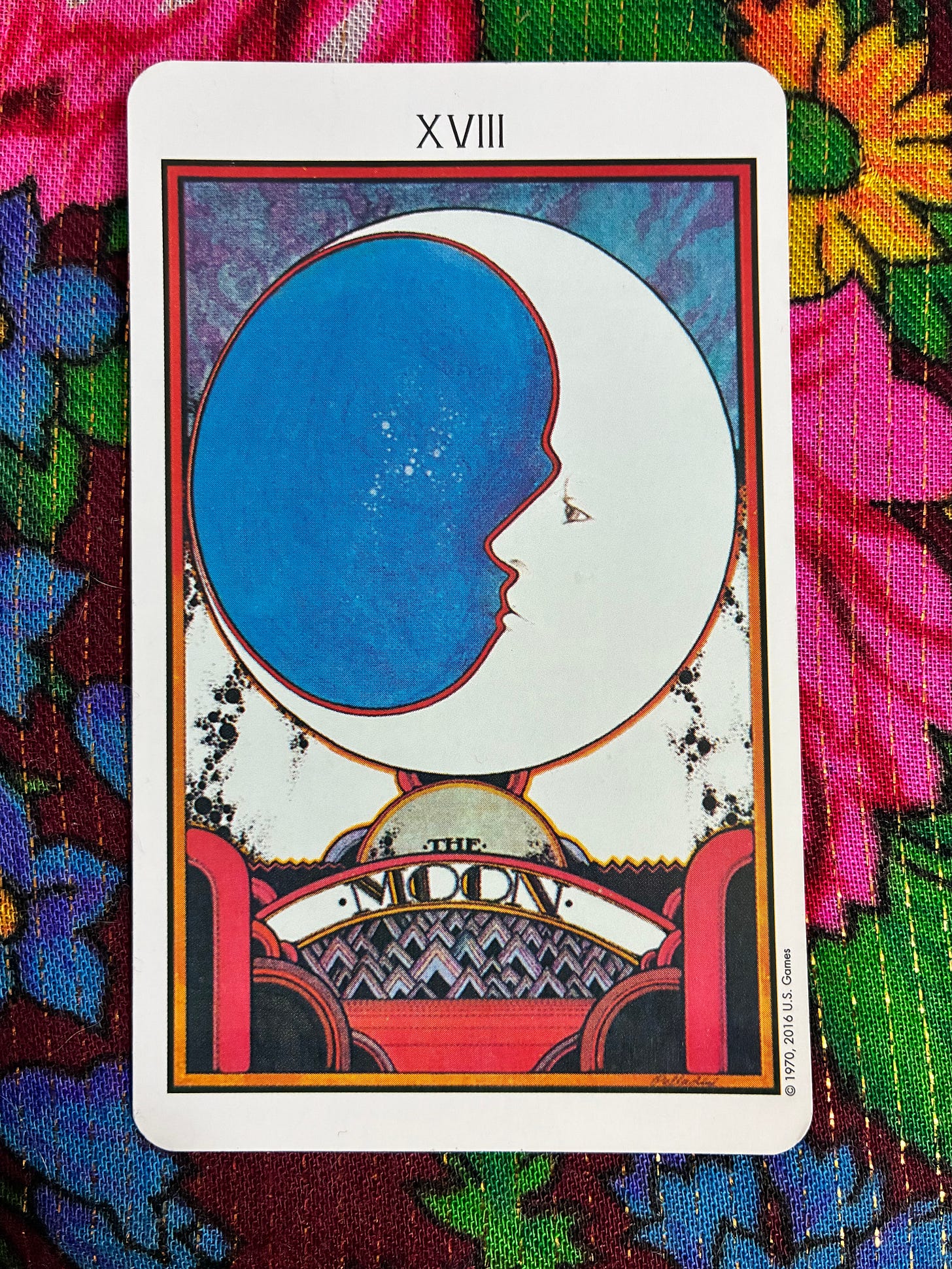 Speaking of surrealism, and the need for magic in these times of dissolution and disillusionment, I give you: The Moon. The moon is the archetype of finding our way in the dark, of living by our own lights, of lunacy and extra-sensory perception. This card exemplifies the ethos of I will succeed because I am insane. Yes, there are real dangers in the deep and the hidden and the unbidden, and yet, like every archetype we encounter on this journey, the only way out is through. The Moon speaks to our powers of intuition and the unconscious, as well as to the feral nature within. These themes are apt right now, as Neptune stations direct at 29 degrees Pisces. Being an outer planet, Neptune takes a long time to turn the ship around, so he will be sitting at this point, the last degree of the whole zodiac, for several more weeks before ingressing into Aries (which will be a horse of a completely different color). But for now, Neptune in Pisces brings a spiritual, creative, and compassionate energy to the end of the year, and the end of an era. It’s a good time to ride the waves, rather than trying to force an outcome. It’s a good time to dream.